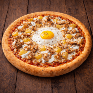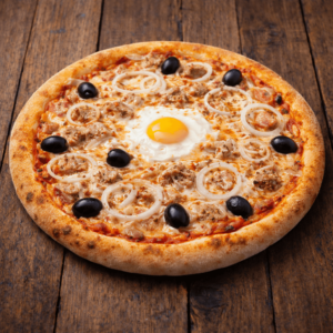 Tomate, fromage, thon, olives, oignons, oeuf