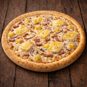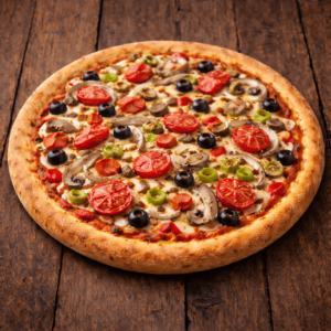 Tomate, fromage, olives, oignons, champignons, poivrons, tomates fraîches