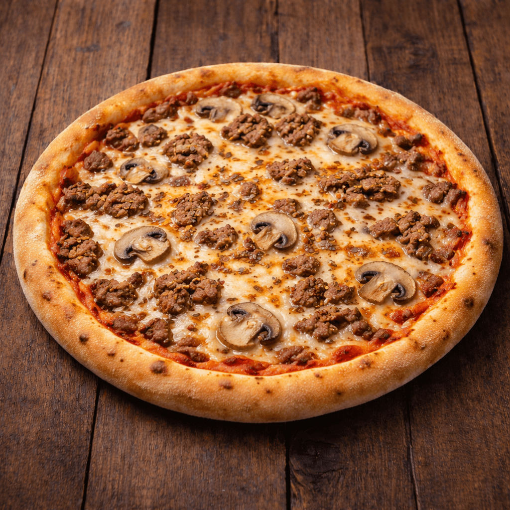Tomate, fromage, oignons, poivrons, olives, merguez, oeuf