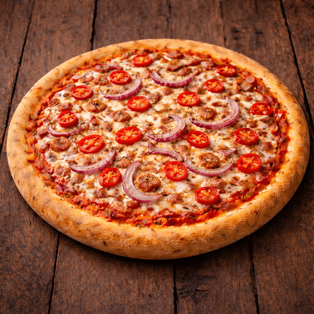 Crème fraîches, fromage, tomate, lamelles de kebab, oignons, tomates