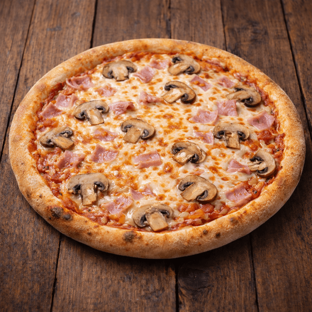 Tomate, fromage, champignons, jambon, chorizo, oeuf