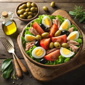 Salade, tomates, thon, pommes de terre, maïs, œuf